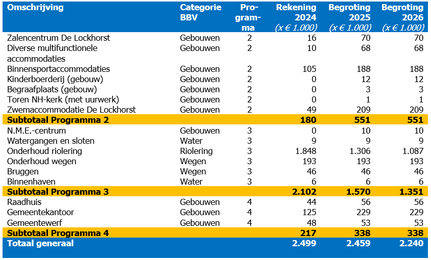Hieronder gaan we verder in op de beleidsvelden openbaar groen en speelvoorzieningen, riolering, waterbeheer, wegen, bruggen, openbare verlichting, gebouwen, binnenhaven en reserveringen voor onderhoud.